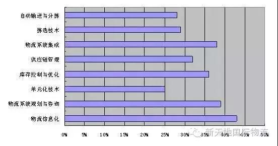 根据问卷分析,企业在回答未来5年企业需要发展那些物流技术来提升物流水平问题时,回答物流信息化技术的占43%;回答物流系统规划与咨询的占39%,回答物流系统集成技术的占38%,回答物流企业库存控制技术的占36%;回答企业供应链管理技术的占32%;回答自动输送与分拣技术的占28%;回答先进的物流作业拣选技术的占29%。