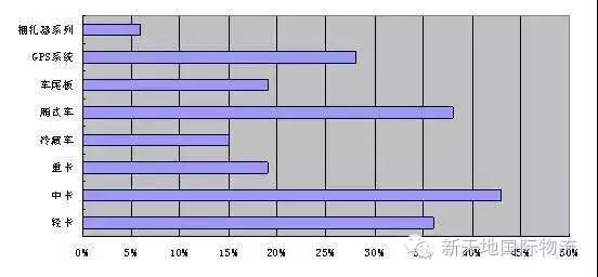 未来5年企业采购轻卡的比例为36%;中卡的比例43%;重卡的比例19%;冷藏车比例15%;专用厢式车比例38%;车尾板比例19%、GPS系统的比例28%;捆扎器系列的比例6%;具体如下图所示:在这些企业中,预计购买微型卡车占9%,预计购买轻卡的占52%,预计购买中卡的占48%,预计购买重卡的占11%。