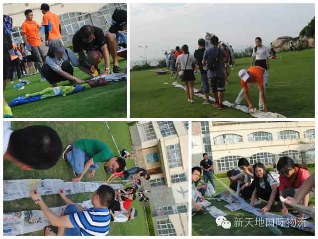 (要求各小队利用分到手上的报纸和胶带,粘成一个长带,各小队分别排成纵列,把带子通过头顶的手步行运动传送,看谁最先到达指定目的地为胜利。)