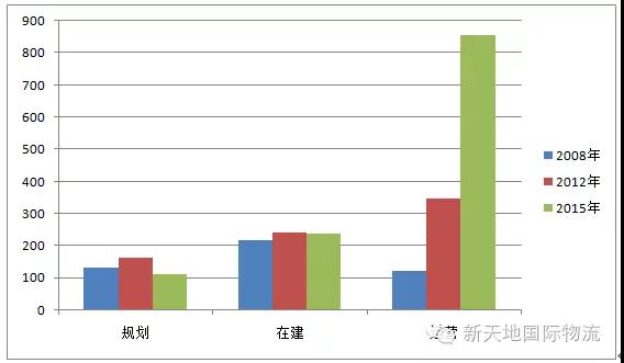 与前两次全国物流园区调查数据相比,本次处于运营状态的物流园区数量大幅上升,由2012年的348家上升至2015年的857家。处于在建状态的物流园区的数量与2012年基本持平。如下图所示: