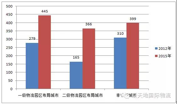 根据《全国物流园区发展规划(2013—2020年)》,我们对所确定的物流园区布局节点城市进行分析。本次调查显示,近三年来国家规划的节点城市物流园区数量增长较快,其中一级物流园区节点城市的园区数量由2012年的279家增长到2015年的445家;二级物流园区节点城市的园区数量从2012年的165家增长到2015年的366家。