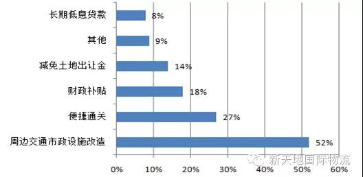问卷调查结果显示,物流园区吸引企业入驻的优惠条件最主要的是周边交通市政设施改造,其次依次是便捷通关、财政补贴和减免土地出让金。如图24所示。这表明政府政策措施对物流园区发展的影响增大。