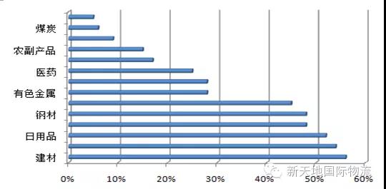 随着我国经济发展方式的转变,钢铁、煤炭、化工等生产资料领域的增速进一步放缓,而第三产业产值增速逐步增加,加之电子商务快速发展,物流需求出现了“黑冷白热”“网涨店缩”的现象。问卷调查数据显示,物流园区流转商品中建材、日用品、食品等生活资料占主要地位。只有不足50%的物流园区流转商品中含有钢材、纺织品,而流转商品中含有色金属和化工品的物流园区仅占到28%,含有煤炭的物流园区仅占到6%,这与2012年调查时相比均有大幅度下降。如下图所示: